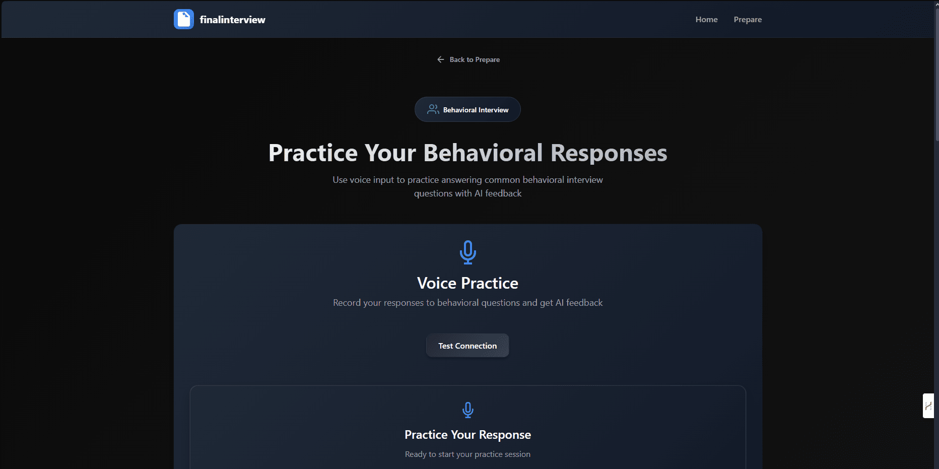 - Behavioral Training Flows: Designed voice-based behavioral practice with common interview questions, STAR method education, and iterative feedback loops.