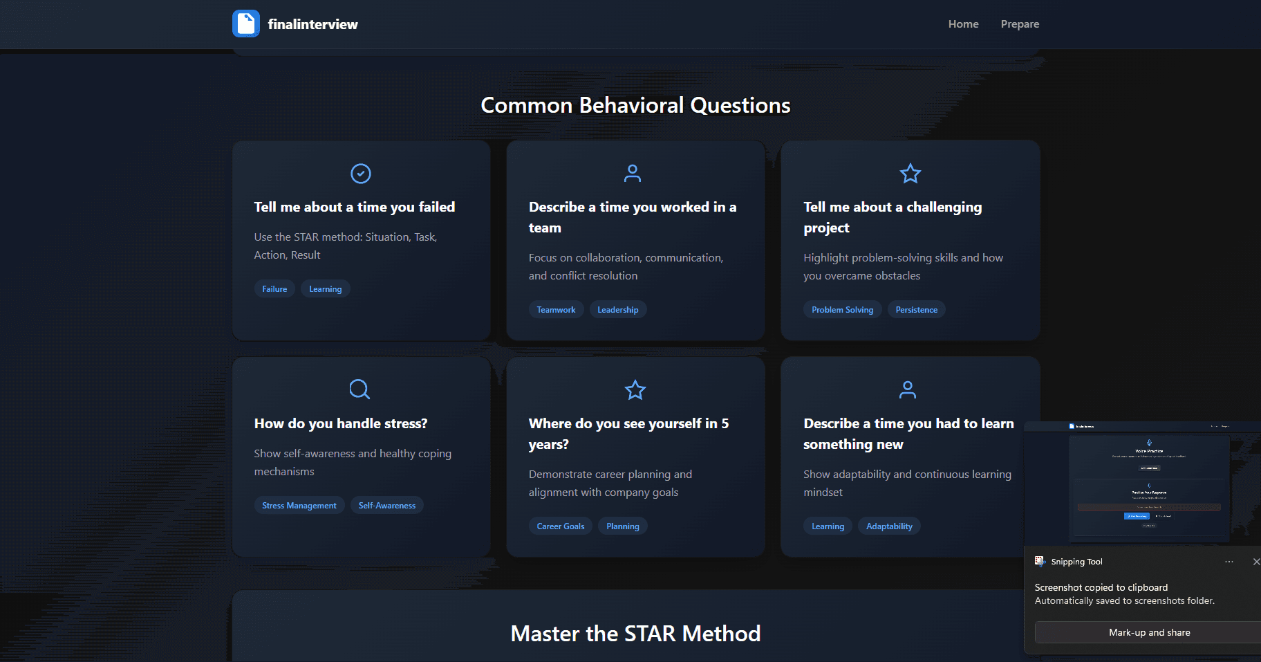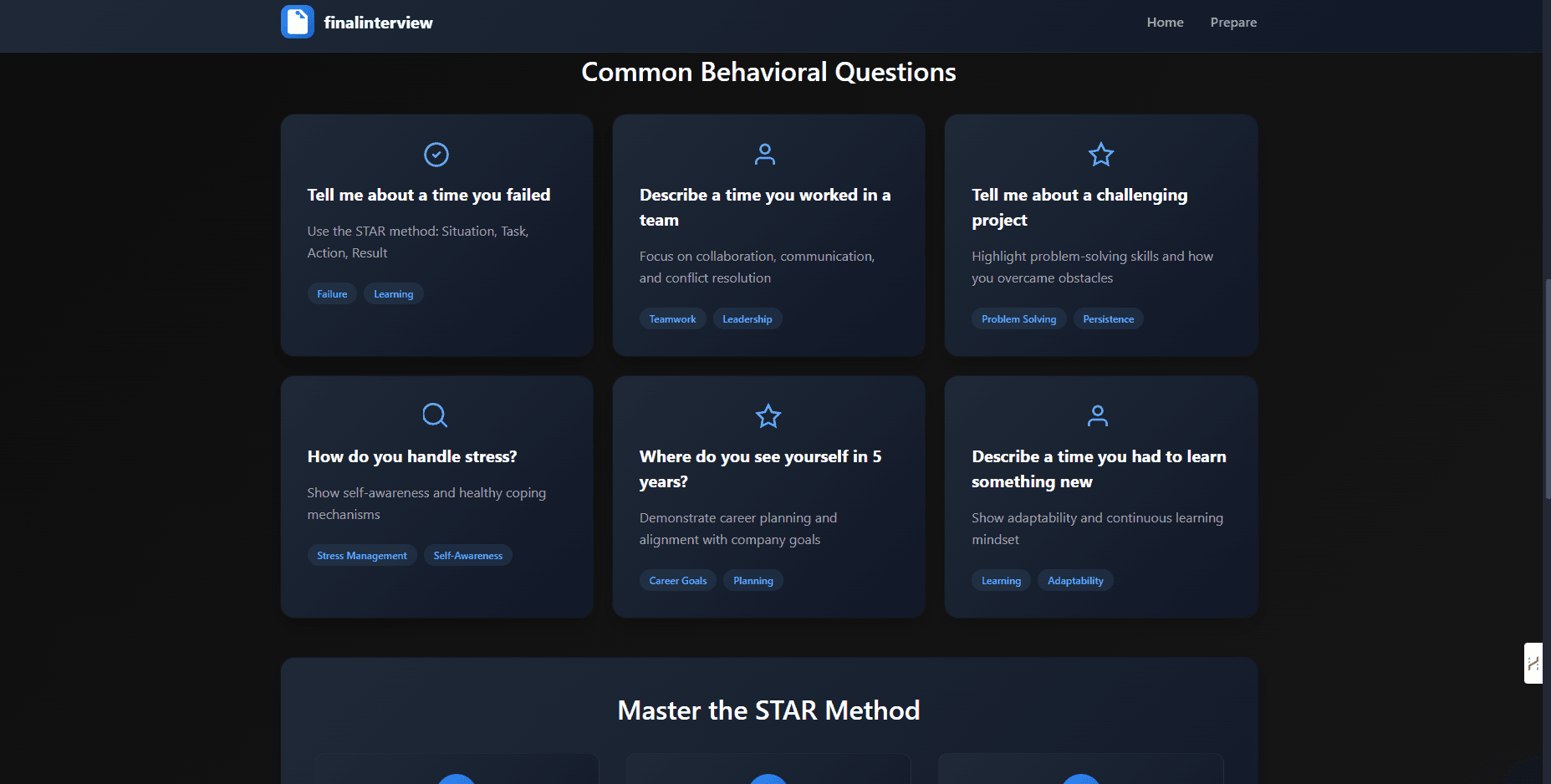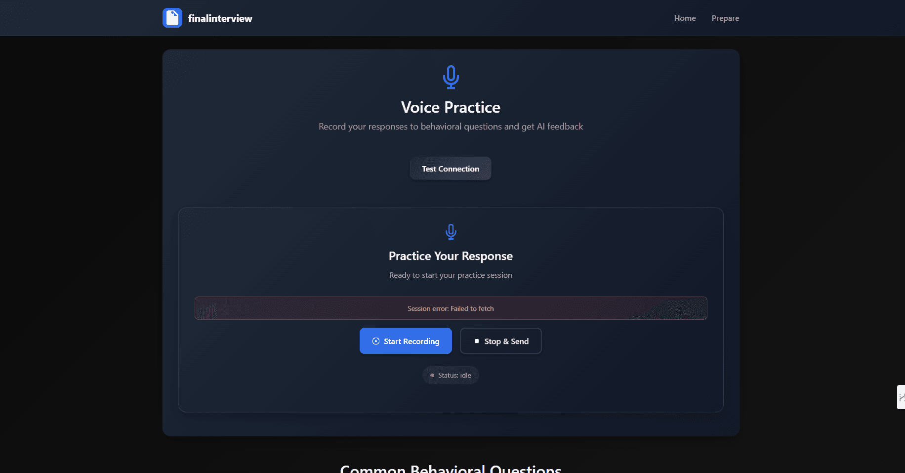 - State & Session Flows: Designed page and component structure (Home, Prepare, Technical, Behavioral) to support clear user journeys for technical and behavioral interview practice.