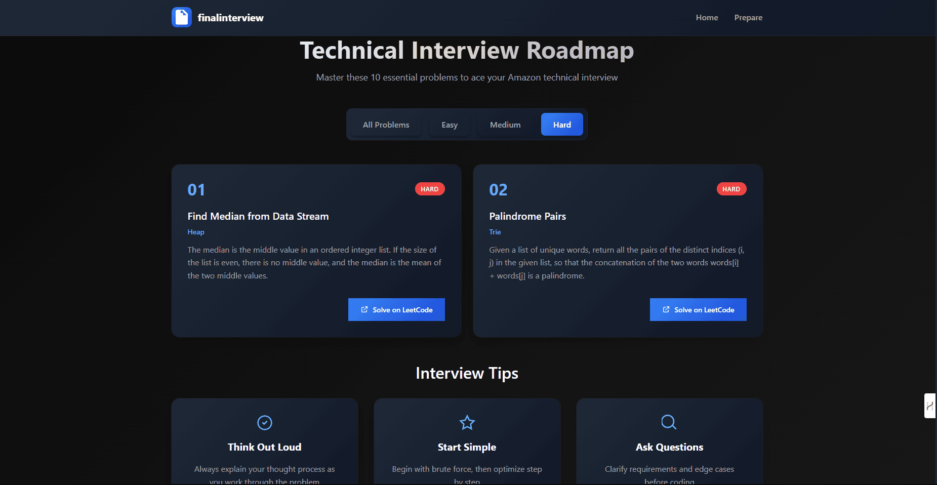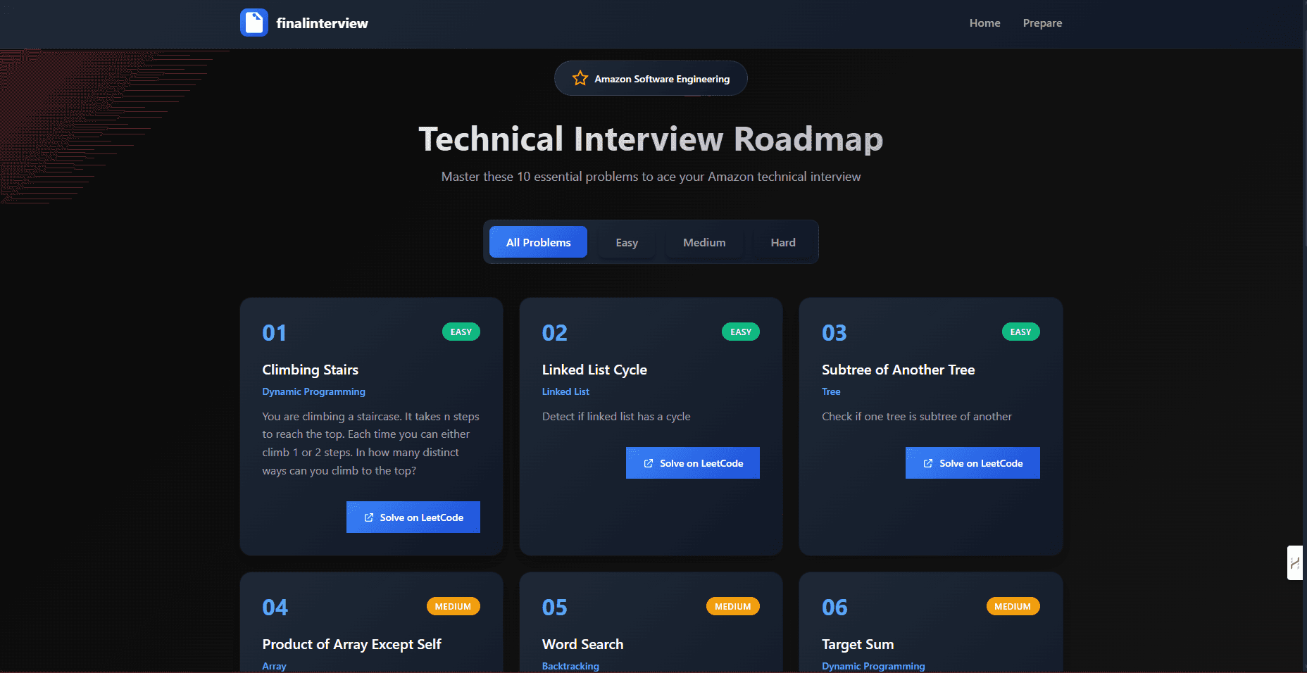 - Technical Interview Roadmap: Curated LeetCode-linked coding problems with difficulty filters (Easy/Medium/Hard) to mirror real technical screening expectations.