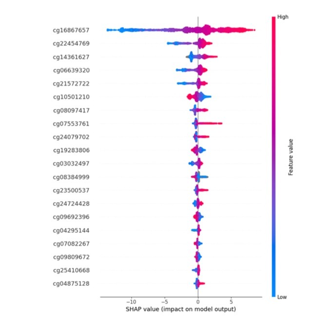 Feature Selection: Extracted top contributing features (500 CpG sites) from large feature spaces using SHAP-based importance ranking